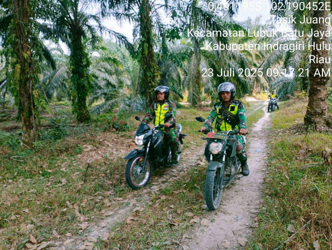 Hari ini, Serka Nana Supriatna beserta rekan babinsa sekecamatan dari Koramil 04/Pasir Penyu Kodim 0302/Inhu melaksanakan patroli di Desa Tasik Juang Kecamatan Lubuk Batu Jaya (LBJ), Kabupaten Inhu. Rabu (23/07/2025).
