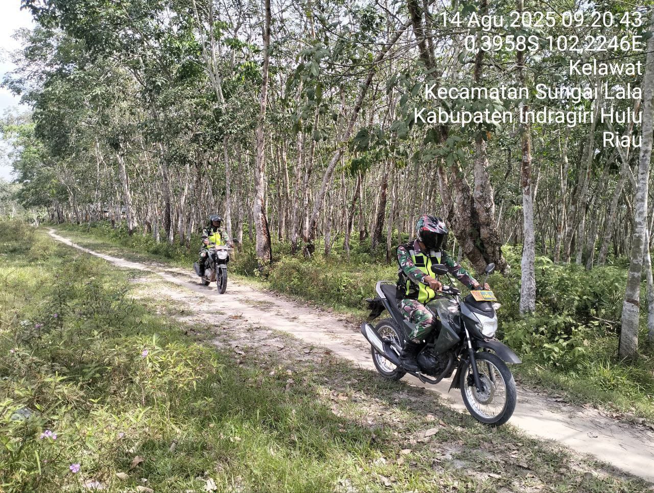 HunterNews Inhu – Babinsa Koramil 04/Pasir Penyu Kodim 0302/Inhu Sertu Andi Kesuma bersama rekan personil babinsa lakukan patroli bersama ke areal perkebunan milik warga maupun melakukan pembinaan dan penyuluhan kepada pekerja panen untuk mengantisipasi dan mencegah terjadinya kebakaran hutan dan lahan (Karhutla) di Desa Kelawat Kec. Sungai Lala Kab. Inhu. Kamis (14/08/2025).