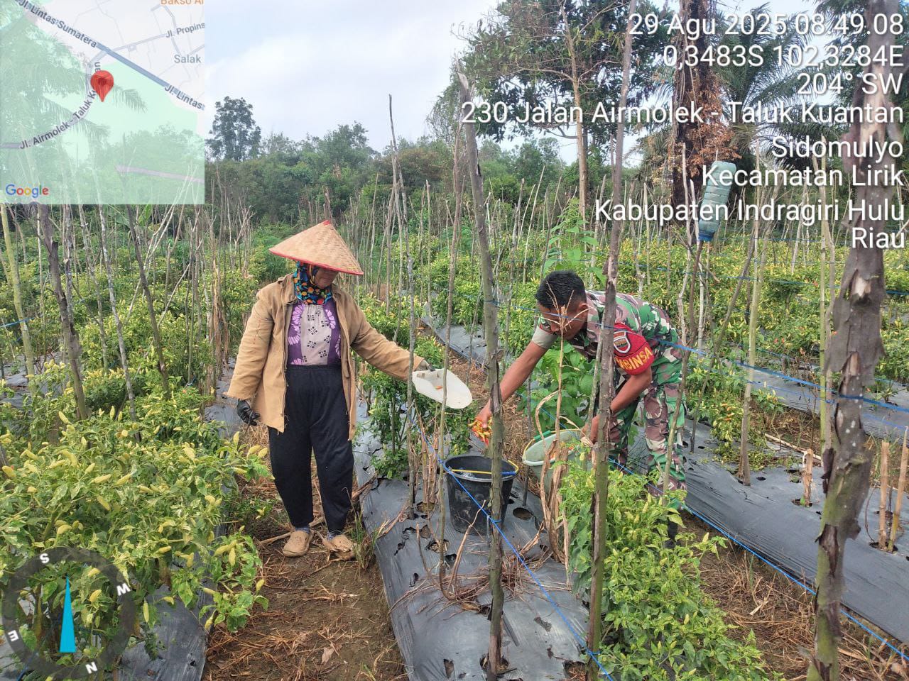 HunterNews Inhu – Babinsa Koramil 04/Pasir Penyu Kopka Bambang Hadi Wijaya melaksanakan pendampingan petani dengan membantu memanen cabe guna sedikit meringankan pekerjaan petani di Desa Sidomulyo Kecamatan Lirik Kabupaten Inhu, Jumat (29/08/2025).