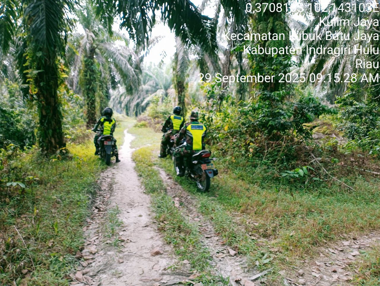 HunterNews Inhu – Babinsa Koramil 04/Pasir Penyu Kodim 0302/Inhu Sertu Ilson Syafriadi rutin melakukan patroli dan sosialisasi antisipasi Kebakaran Hutan dan Lahan (Karhutla) di wilayah Teritorial Koramil salah satunya saat ini di desa Kulim Jaya, Kecamatan LBJ (Lubuk Batu Jaya), Kabupaten Inhu, Senin (29/09/2025).