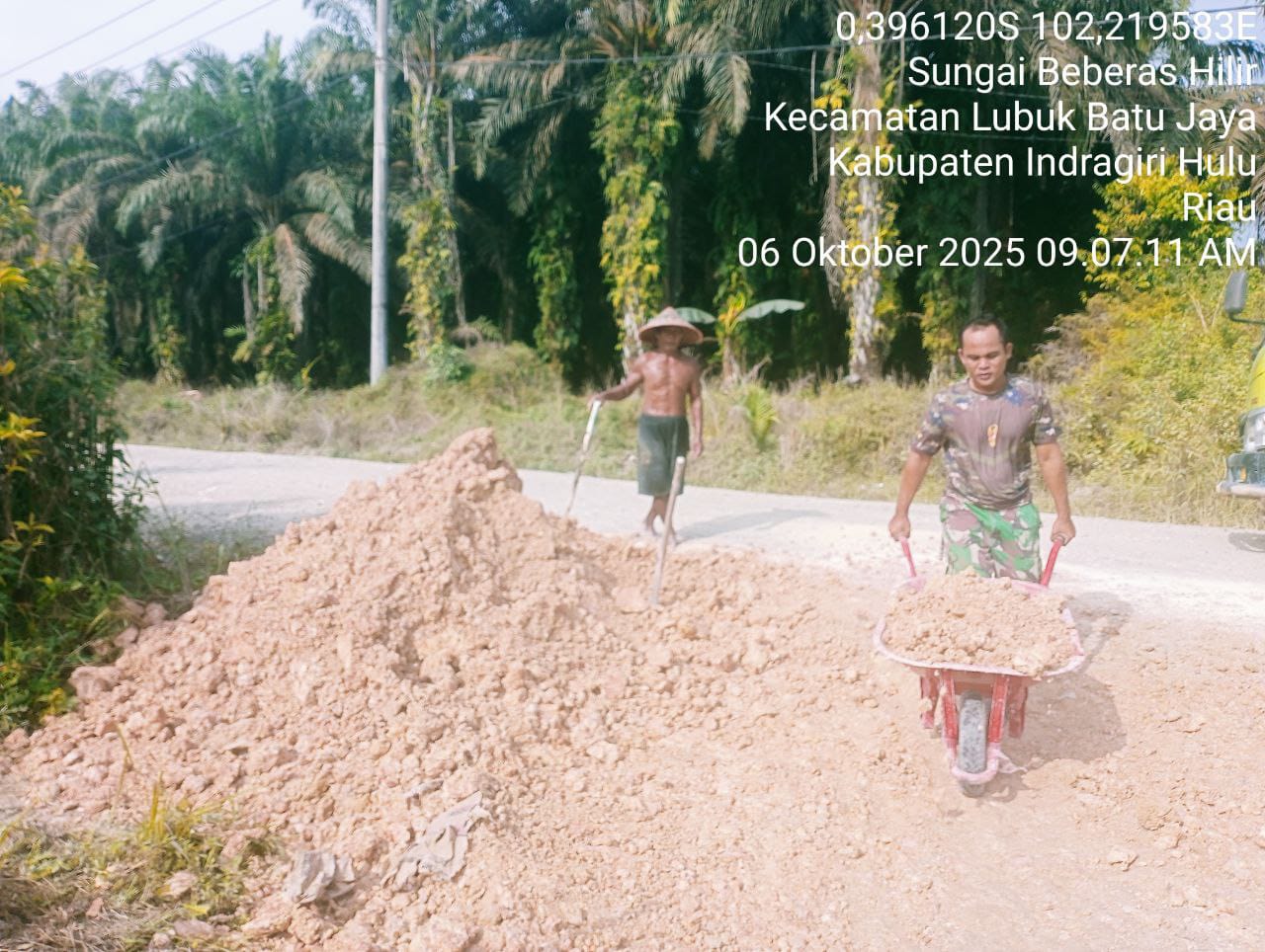 HunterNews Inhu – Babinsa Koramil 04/Pasir Penyu Kodim 0302/Inhu Serda Arozi Sekhi Lase melaksanakan gotong royong membantu menimbun Pondasi rumah mikik bapak Arman salah satu warga Desa Sungai Beberas Hilir, Kecamatan Lubuk Batu Jaya, Kabupaten Inhu. Senin (06/10/2025).