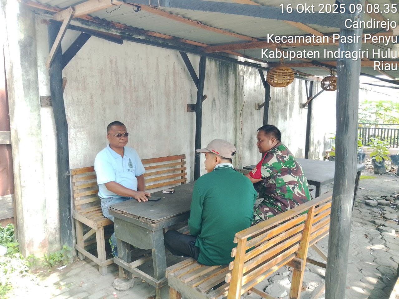Pada kesempatan komsos tersebut,Babinsa Koramil 04/PP Kodim 0302/Inhu Kopda Syahrul Majid menyampaikan kepada warga binaan di Desa Candirejo Kecamatan Pasir Penyu Kabupaten Inhu bahwa pentingnya menjaga keamanan dan ketertiban di lingkungan desa (Kamtibmas). Kamis (16/10/2025).
