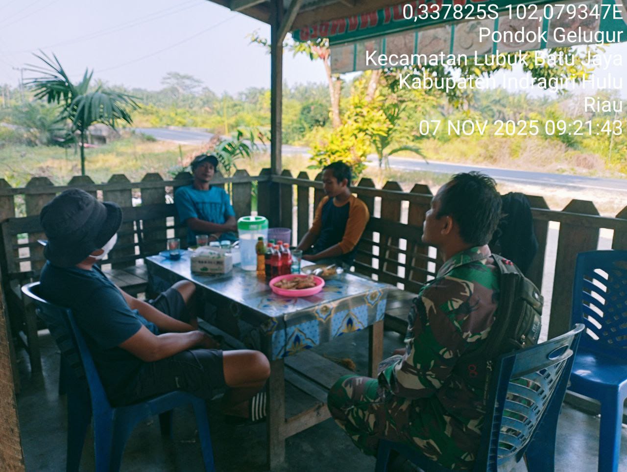 Seperti Babinsa Koramil 04/PP Kodim 0302/Inhu Serda Arozi Sekhi Lase yang melaksanakan komsos bersama Tokoh Masyarakat di Desa Pondok Gelugur Kecamatan LBJ (Lubuk Batu Jaya) Kabupaten Inhu.