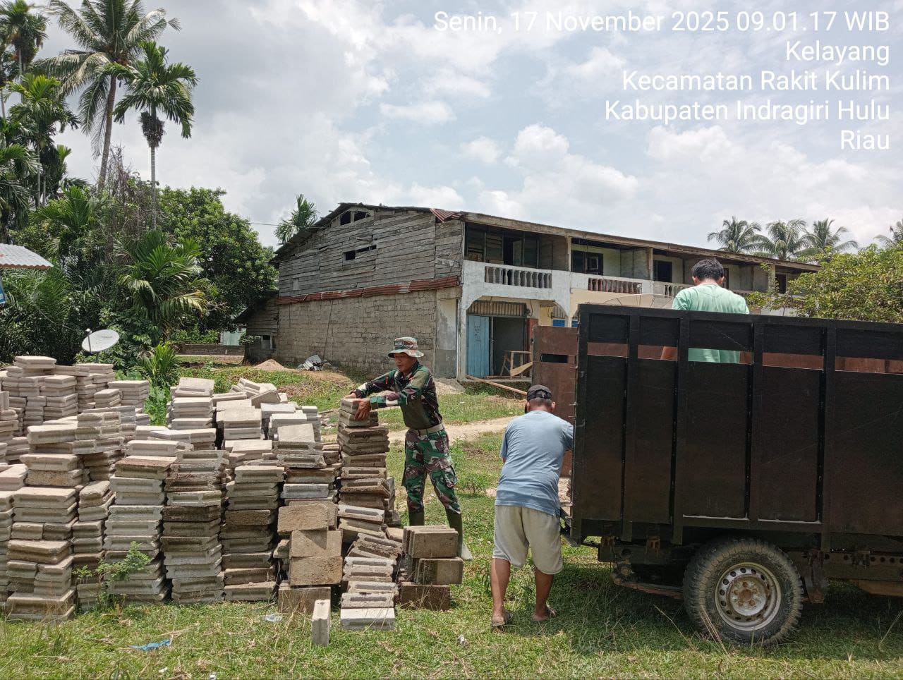 Inhu, HunterNews Com – Babinsa Koramil 04/Pasir Penyu Kodim 0302/Inhu Serda Suharmansyah membantu warga melangsir/mengangkat Batako untuk pembangunan Warung Bapak Miswan di Desa Kelayang Kecamatan Rakit Kulim Kabupaten Inhu, Senin (17/11/2025).