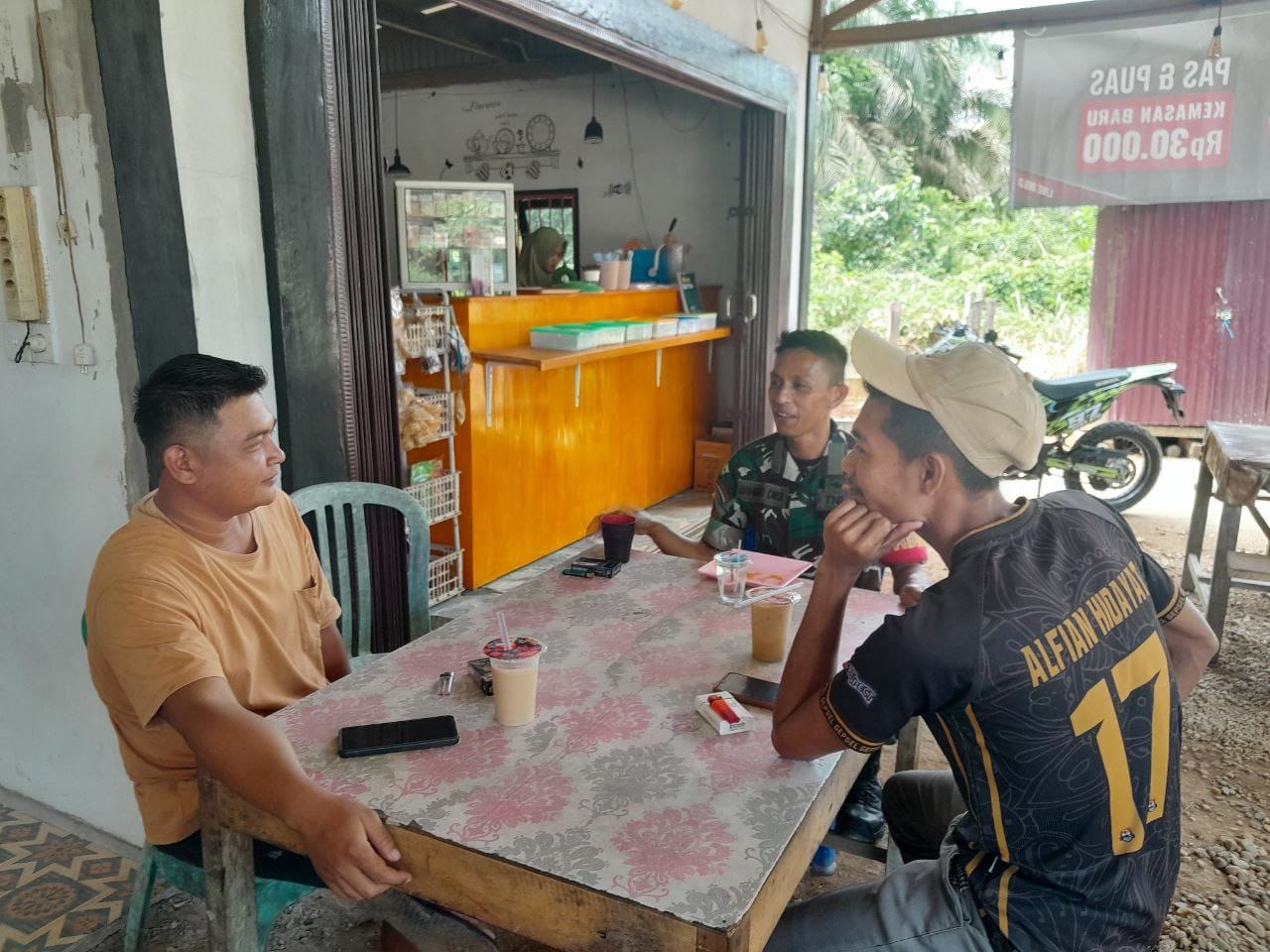 Kali ini, Babinsa Kopda Rahmad Dika memanfaatkan warung Kopi untuk berkomunikasi dengan warga binaannya.