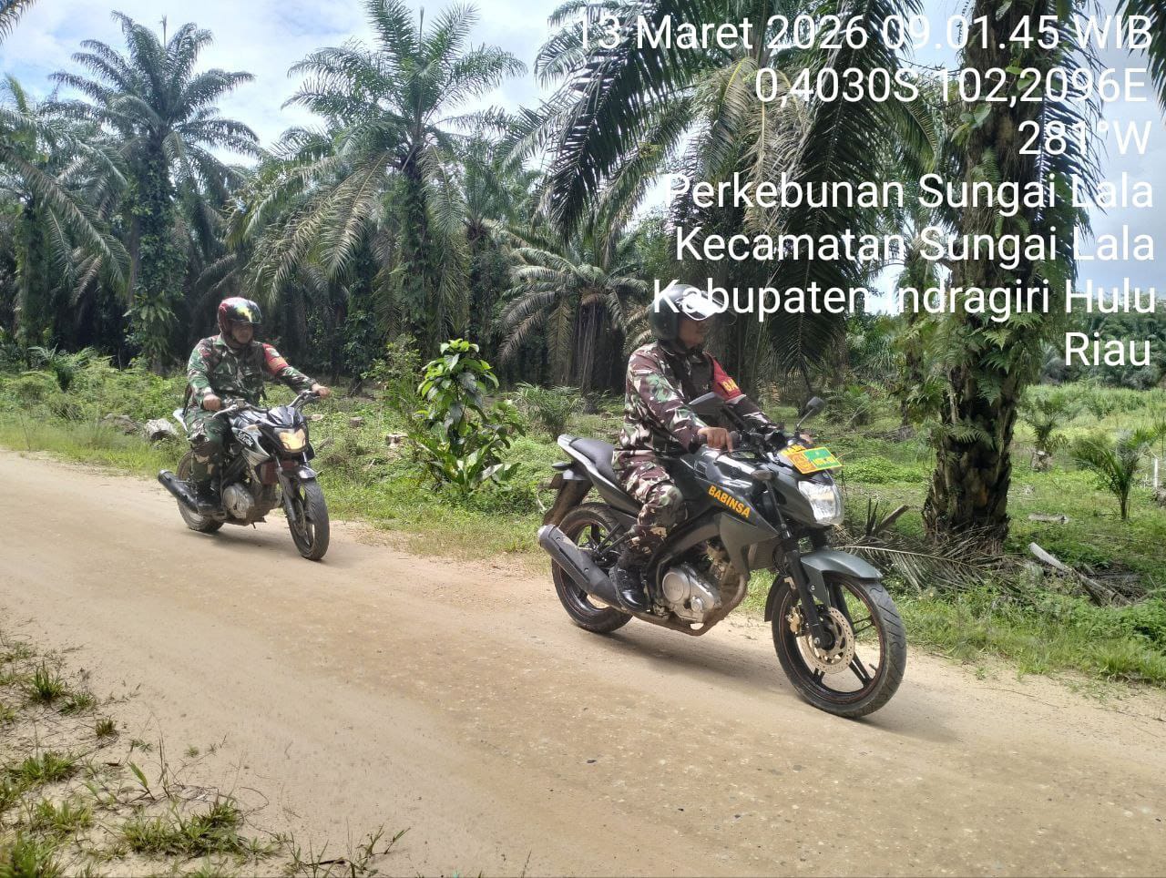 HunterNews Com – Koramil 04/Pasir Penyu Kodim 0302/Inhu Babinsa Sertu Andi Kesuma Beserta rekan babinsa sekecamatan melaksanakan patroli dan sosialisasi karhutla Desa Perkebunan Sei. Lala Kec. Sei Lala Kab. Inhu. Jumat (14/03/2026).