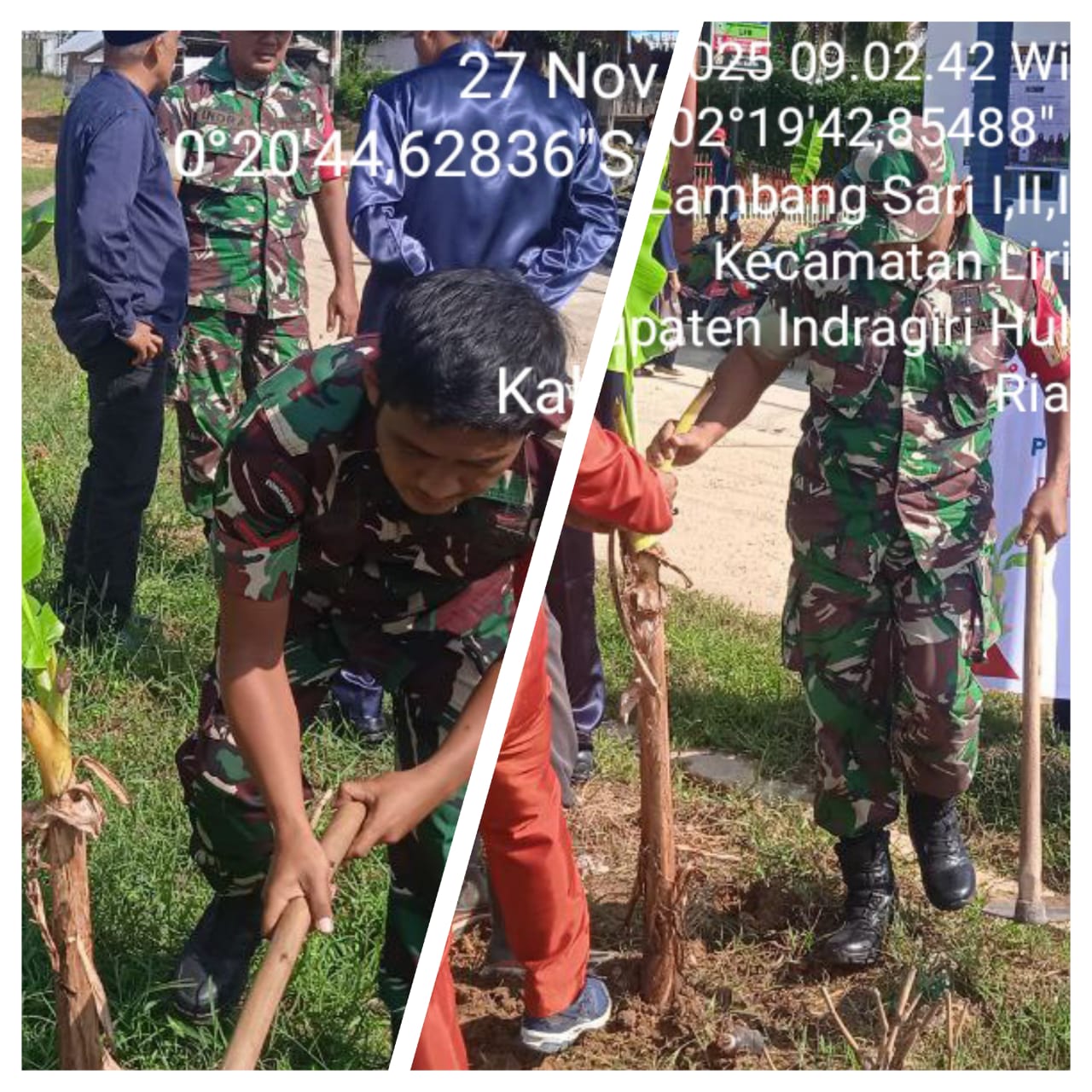 Inhu, HunterNews Com – Suasana kebersamaan terlihat di Desa Lambang Sari I,II,III, Kecamatan Lirik, Kabupaten Inhu, saat Babinsa Koramil 04/Pasir Pa, Serda Indra Dan Kopda Hadi Satiawan, ikut turun langsung membantu perangkat desa dan warga menanam bibit pisang roti di lahan pertanian desa, Kamis (27/11/2025).