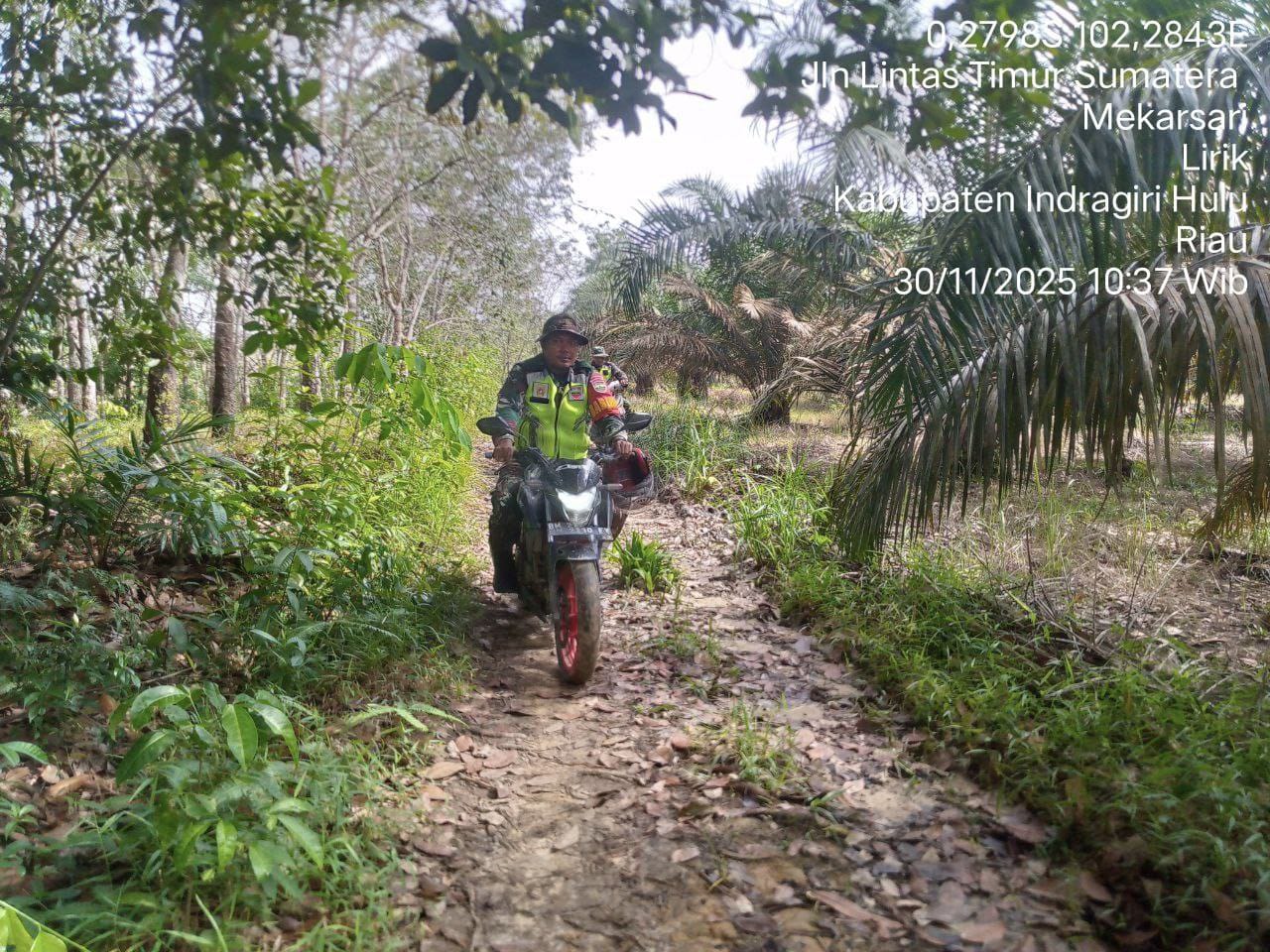 Koramil 04/Pasir Penyu Kodim 0302/Inhu, tidak hanya saat musim kemarau, Babinsa Serma Adi Surachman Barus bersama rekan Babinsa Sekecamatan melaksanakan patroli Karhutlah di Desa Banjar Balam Kec. Lirik Kab. Inhu, Minggu (30/11/2025).
