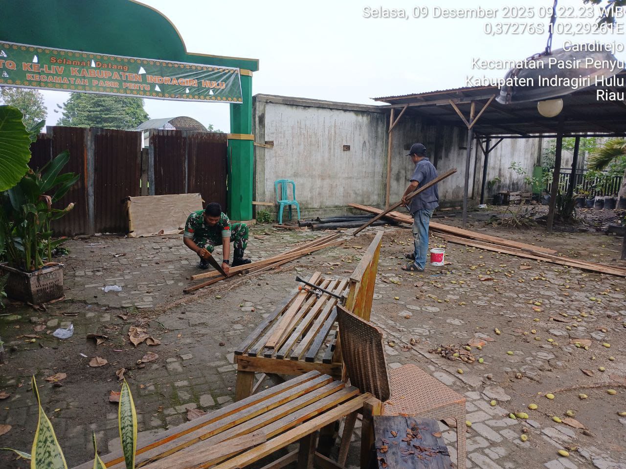 HunterNews Com – Babinsa Praka Ahmad Khoirul Huda Koramil 04/Pasir Penyu Kodim 0302/Inhu Membantu Bapak Beni (45) mebuat warung kopi di Desa Candi Rejo Kec. Pasir Penyu Kab. Inhu.Selasa (09/12/2025).
