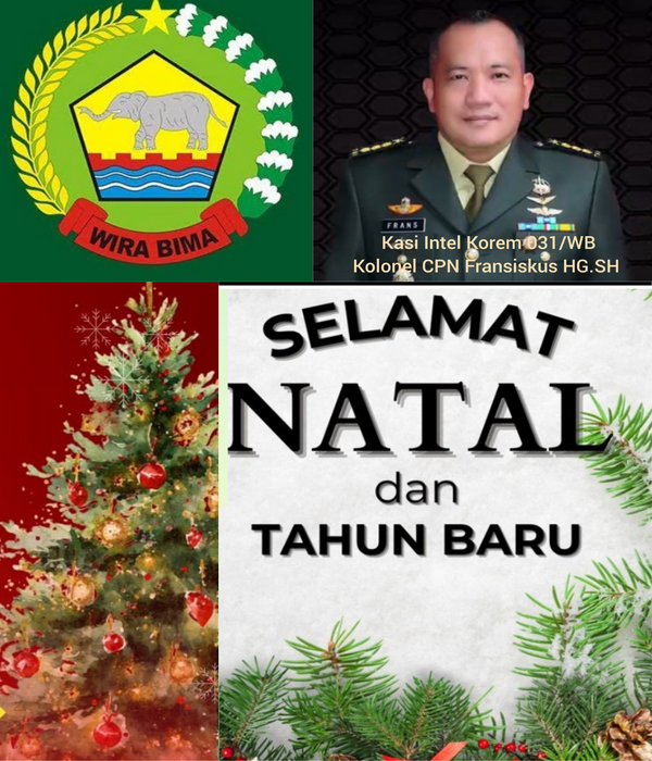 Kasi Intel Korem 031/WB Korem 031/WB Admin 25 Desember 2025 1 minute read Keluarga Besar Korem 031/Wira Bima Selamat Natal dan Tahun Baru, (25 Desember 2025) Related Posts:Kasi Intel Korem 031/WB, Kolonel CPN Fransiskus HG,…Ciptakan Kamtibmas Polsek Pasirpenyu Gelar Apel…Komisaris PT HunterNews Group : Selamat Kepada…Dukungan Dari PT TPP Pembangunan Gedung MIN 1 di…Polsek Lubuk Batu Jaya Gelar Apel Persiapan…Suami Kabur Gara Gara Narkoba, Istri Cs Keciduk, DPO… Post Views: 46 Post navigation Previous: HunterNews ComNext: Satlantas Polres Inhu Tertibkan Kendaraan Angkutan Barang Sumbu 3 dalam Rangka Ops Lilin Lancang Kuning 2025 Related Stories Kasi Intel Korem 031/WB Kasi Intel Korem 031/WB, Kolonel CPN Fransiskus HG, SH, Salurkan Bantuan Untuk Pembangunan Gedung MIN 1 di Airmolek Admin 9 Oktober 2025