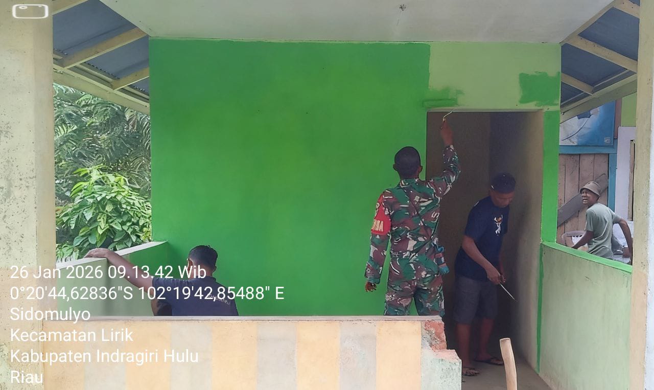 HunterNews Com – Babinsa Koramil 04/Pasir Penyu Kodim 0302/Inhu Kopda Hadi Satiawan Beserta Perangkat Desa melaksanakan Pemeliharaan Bangunan dengan Mengecat Pos Siskamling Desa yang menjadi pembatas antar desa di Desa Sidomulyo Kec. Lirik Kab. Inhu. Senin (26/01/2026).