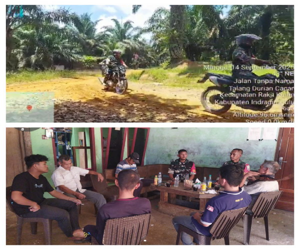 HunterNews Inhu –Babinsa Koramil 04/Pasir Penyu Kodim 0302/Inhu Serma Ari Sucipto dan rekan babinsa sekecamatan ajak warga dalam ini hal tokoh adat dan perangkat desa melaksanakan patroli wilayah guna menjaga kondusifitas Desa Durian Cacar Kec. Rakit Kulim Kab. Inhu. Minggu (14/09/2025).