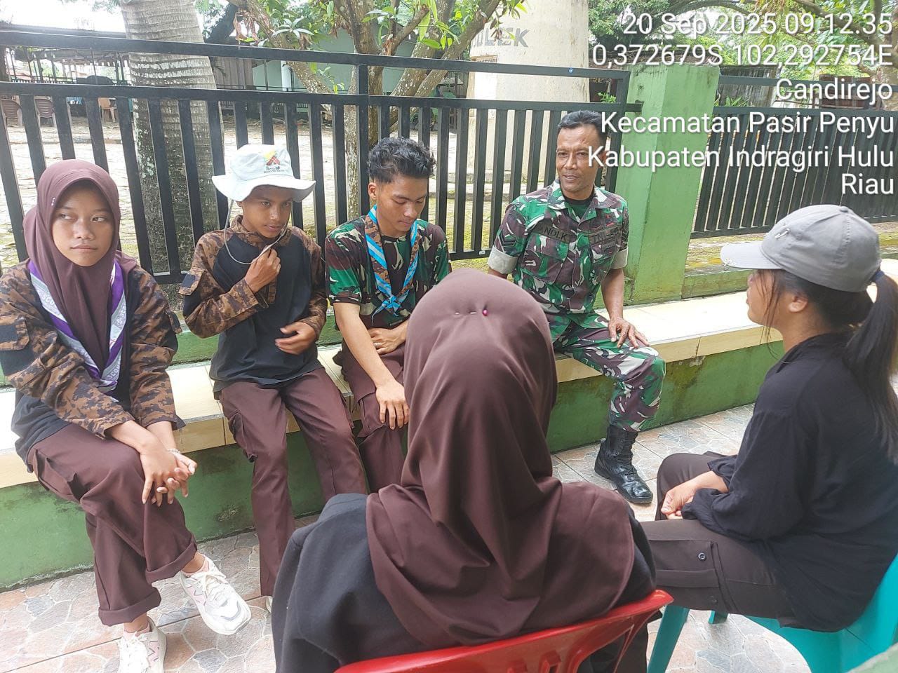 HunterNews Inhu – Kosmos (Komunikasi Sosial) tidak mengenal dengan siapapun,tugas tetap berjalan sperti yang dilakukan oleh Babinsa diwilayah binaan, dalam kesempatan ini seperti yang dilakukan oleh Babinsa Koramil 04/Pasir Penyu Kodim 0302/Inhu Sertu Andi Kesuma kewilayah binaan untuk melaksanakan kegiatan Komunikasi Sosial (Komsos) bersama dengan Anak-anak pramuka di Desa Candirejo Kecamatan Pasir Penyu Kabupaten Inhu. Senin ( 20/09/2025).
