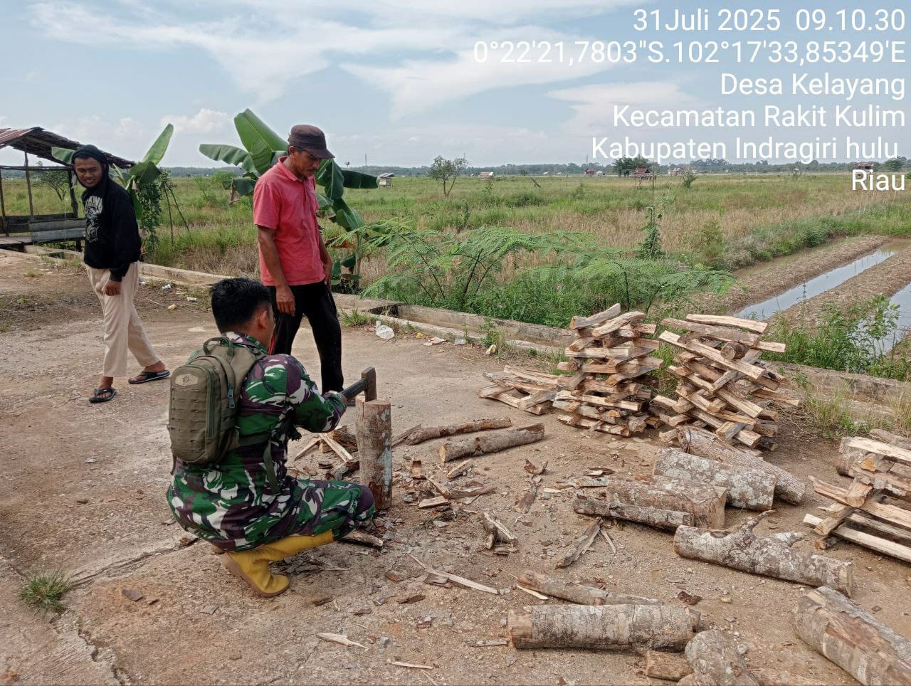 Hunter News Inhu – Babinsa Koramil 04/Pasir Penyu Kodim 0302/Inhu Koptu Edi Winarjono membantu membelah kayu bakar milik warga guna keperluan memasak, di Desa Kelayang Kecamatan Rakit Kulim Kab. Inhu. Kamis (31/07/2025).