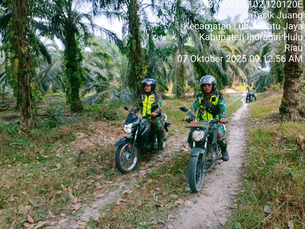 Hari ini, Serka Nana Supriatna beserta rekan babinsa sekecamatan dari Koramil 04/Pasir Penyu Kodim 0302/Inhu melaksanakan patroli di Desa Tasik Juang Kecamatan Lubuk Batu Jaya (LBJ), Kabupaten Inhu. Selasa (07/10/2025).