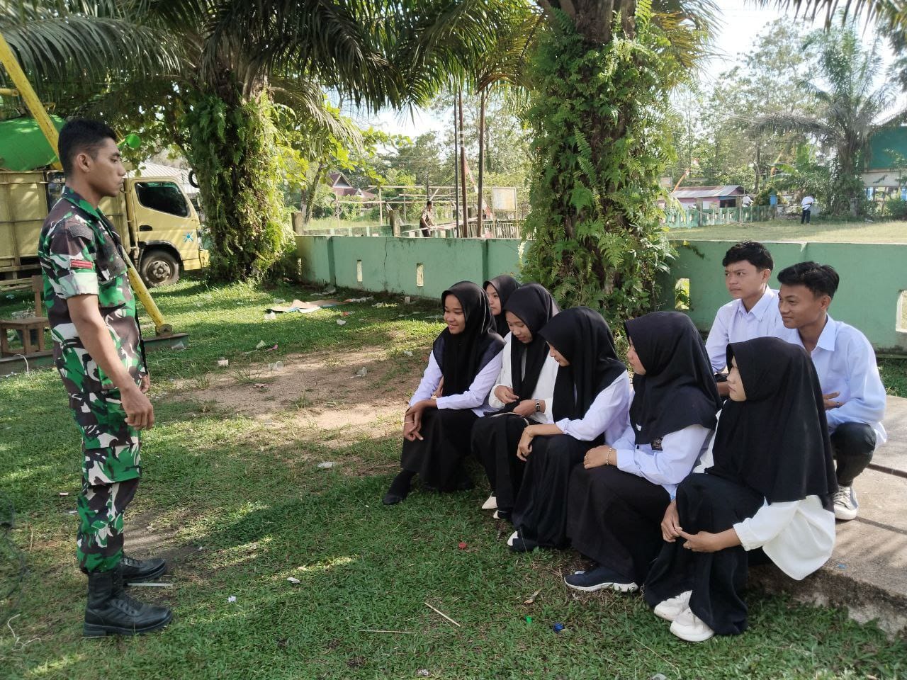 HunterNews Inhu – Babinsa Koramil 05/Peranap Kodim 0302/Inhu Pratu Rendi Rinaldi Memberi motivasi kepada anak sekolah SMK N 1 Batang Peranap yang melaksanakan Praktek Kerja Lapangan (PKL) di halaman Kantor Koramil 05/Peranap Kel. Peranap Kecamatan Peranap Kabupaten Indragiri Hulu. Rabu (17/09/2025 )