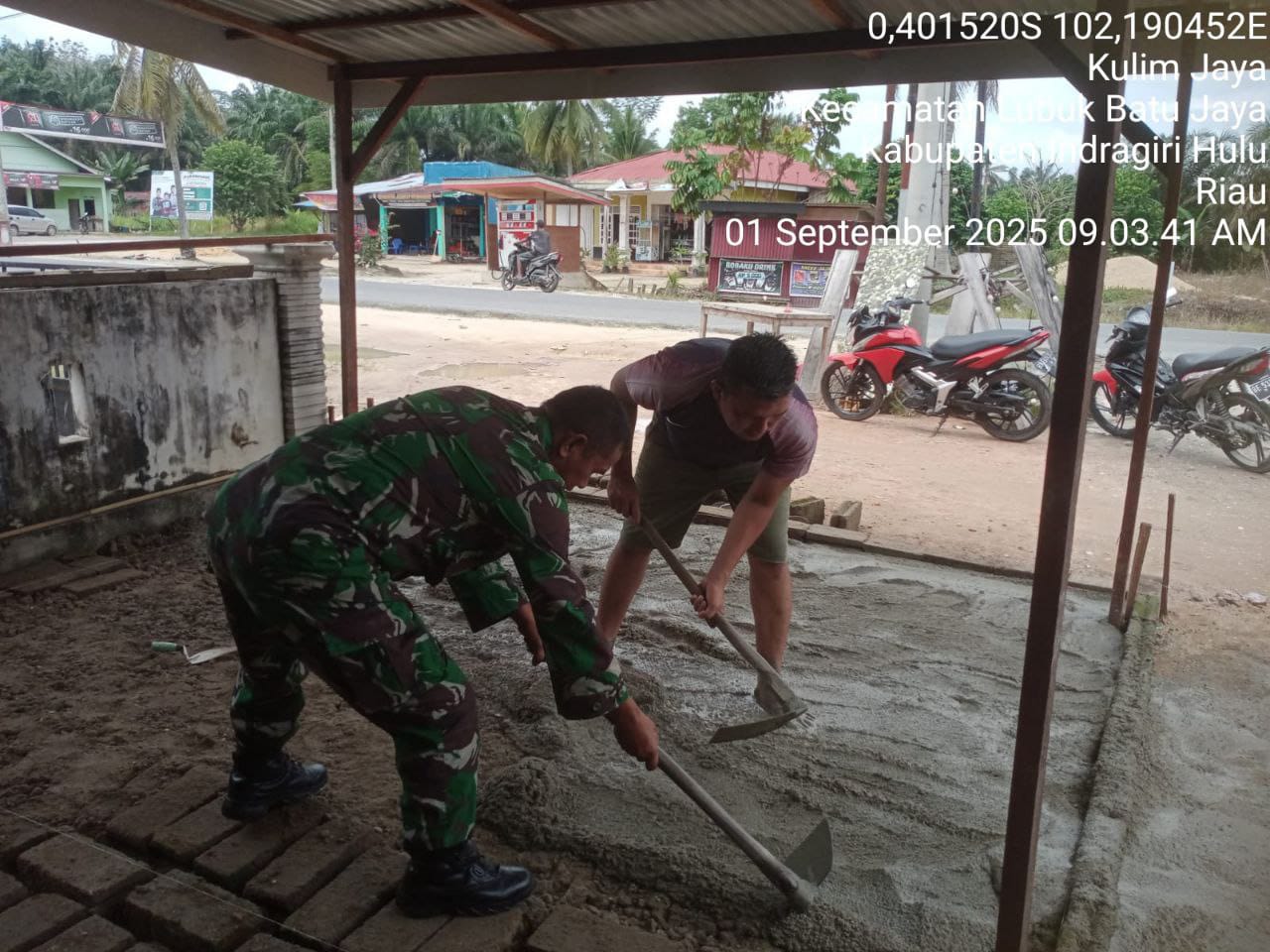 HunterNews Inhu – Babinsa Koramil 04/Pasir Penyu Kodim 0302/Inhu Sertu Ilson Syafriadi membantu pengecoran lantai dalam renovasi warung milik rumah Bapak Marji di Desa Kulim Jaya, Kecamatan Lubuk Batu Jaya (LBJ) Kab. Inhu, Senin (01/09/2025).